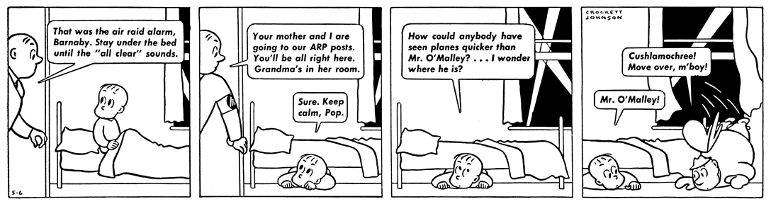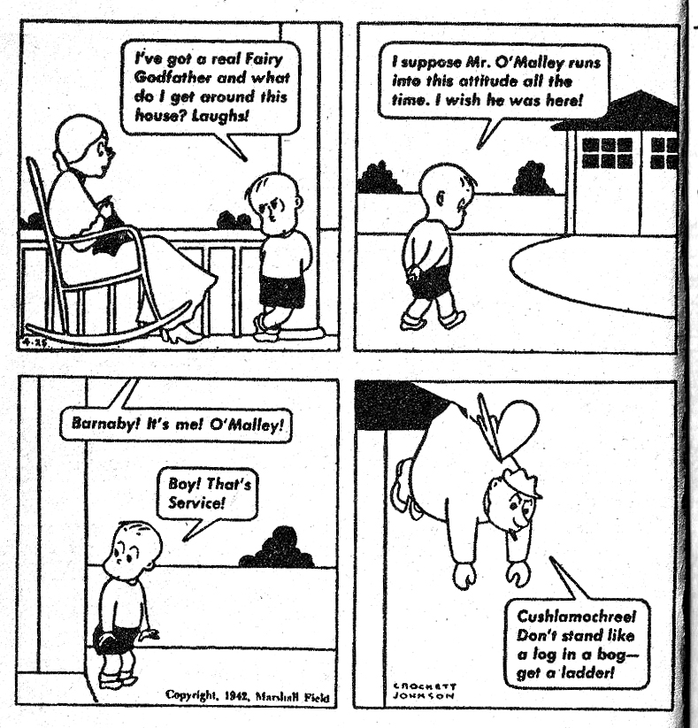 BARNABY, by Crockett Johnson, is less a newspaper strip than it is an object of love. Only mildly successful during its 1942-1952 run (a warm-up for the career-making, genre-defining classic HAROLD AND THE PURPLE CRAYON, which features an identical protagonist), it has attracted not a large fan base but a wildly, irrationally enthusiastic cult of supporters and proselytizers, including Dorothy Parker, Art Spiegelman, Duke Ellington, Chris Ware and Franklin Delano Roosevelt. (Now that’s a dinner party.)