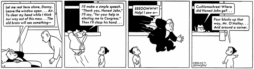 This is the kind of great joke that Johnson specializes in: oddness and disruption so deadpan it seems obvious. Barnaby’s dog Gorgon, it’s suddenly revealed, can talk — but he turns out to be such a rambling bore that everyone just wishes he would shut up. When Barnaby and O’Malley go to visit a giant, he turns out to be three feet tall and “sensitive about his size.” There are very few belly laughs to be had here, more quiet chuckles, and many of the strips seem to forget to supply any punchline at all. But you don’t care — you’re not here for payoffs, you’re here to be immersed in this clean, cracked world, the wry amusements and the utterly recognizable characters who stick with you. The solid earth of perfectly crisp drawing and flawlessly defined personalities allows Johnson to play fast and loose with his invented reality.