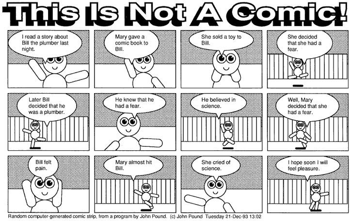 Cartoonist John Pound has been writing computer programs that create comics for over 20 years, but we’ve only just discovered these bafflingly brilliant strips that, I Ching-like, seem to overflow with meaning.