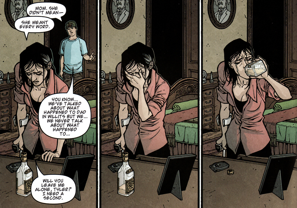 And that, really, is what makes LOCKE & KEY such a profoundly wonderful comic: its rich, generous humanity, its subtle & empathic treatment of its characters. Though the plot is executed with the ruthless, hypnotic efficiency of a John Grisham pot-boiler, the characters are treated with the sensitivity and psychological depth of a literary novel. Nina, for instance, is an alcoholic who we often find drunk and self-pitying when the horrors come for her children. That the book finds this a forgivably tragic character flaw, that your heart breaks for Nina as you watch her try and fail to get her shit together, that you understand the bottomlessness of the grief that has broken her and rendered her useless to the people that need her most, speaks to the huge hearts of the storytellers at work here.