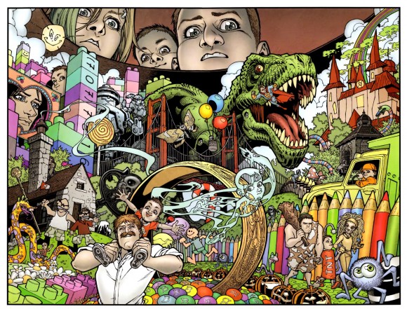 It takes an artist of the caliber of Gabriel Rodriguez to take a concept this preposterous and clever and make it work on the page. He has an enormous capacity for abstraction, for drawing demons in the bubbling thousand-eyed darkness of a Lovecraftian void, but he restrains himself admirably. His greatest strength is the matter-of-factness that sells the wild magic of Joe Hill’s story, the kids who grow to 100 feet tall and pop their skulls open, the shadows that grasp and bite. He establishes a rock-solid cinematic style, and finds just as much magic in the facial expressions of his characters as he does in the special effects of the keys. He repeatedly uses one of my least favorite tropes of modern comics: the static shot that is repeated, panel after panel, to create the beats of a film sequence. Usually it just seems lazy on behalf of artist and writer — the artist only has to draw one background, and the writer can think like a scriptwriter instead of engaging with his chosen medium. But in the hands of Rodriguez, it becomes a potent tool — it allows us to see the subtly variations of expression, to watch these richly layered characters while their faces move and they give themselves away.