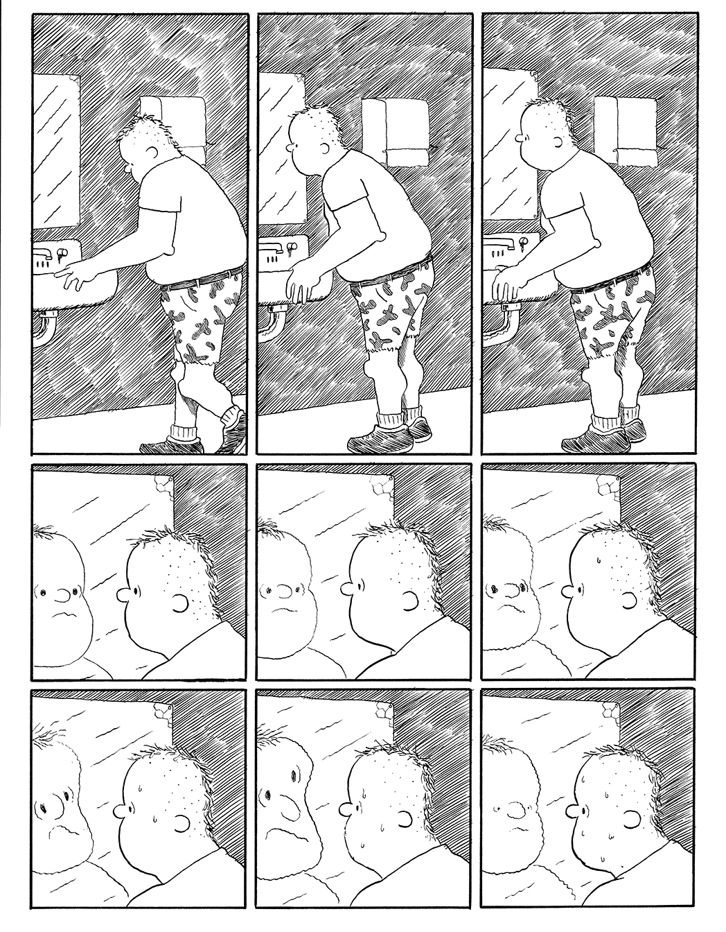 Forsman’s depiction of the trip violates every acid cliché and leaves you with an LSD experience that lays bare the rawness of the material world and gently warps your perceptions around its borders. Everything is funny and scary. Where most artists would go the day-glo-electric-kool-aid route and give us spirals and abstractions, a world melting into bubbling goop and neon colors, Forsman just subtly bends his monochrome reality, frays it at the edges, and yet when it’s played off his anxious minimalist style, the results are more vertiginous and immersive than the hyperactive overstimulatory experimentation of most acid-trip artwork. There’s no indulgence here.