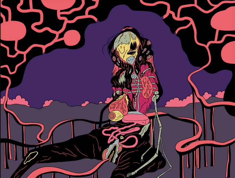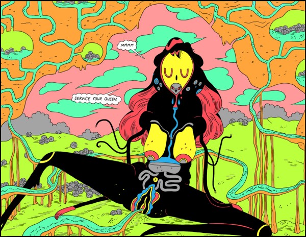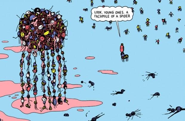 That seems to be DeForge’s great trick in this disturbing, uncomfortable opus of a graphic novel, and it forms a tension that never slackens. We’re introduced to a large cast of ants and other bugs in a detailed, surreal insect world. We’re given so much to identify with, so much that’s recognizably human – the dissatisfaction and intractable misunderstandings of a squabbling couple; a child dealing with his abusive, mentally ill father; ants sitting on couches, watching TV, bitching at one another. But there is also so much that is strange, repulsive, and unknowable – the boy who inhales a cloud of microscopic earthworms and is transformed by them; the spiders with the heads of Tex Avery wolves, who copulate by extending worm-like appendages into one another’s bodies; the queen, drawn like some byzantine flat-perspective centerfold, her legs spread as she’s rotting and dying. The book invites our identification, then rejects it. It gives us recognizable figures in an alien world – one as frightening and foreign as (if not particularly similar to) the insect kingdom itself.