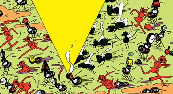 Though there are a lot of strange pleasures to be had here for the reader who enjoys this sort of thing – morbid comedy abounds, DeForge’s linework and design sensibility are inimitably striking, and the bold color choices are directly appealing – ANT COLONY is at its core a very dark, ugly book. DeForge creates situations in which we expect the drama of human connection – a couple divided by war; five runaways trying to find or build a home; an orphaned child, rescued and raised by enemy combatants – but instead gives us amoral coldness. In one typical exchange, one ant says, “What are you doing? Why are you trying to drown that baby?” and his boyfriend replies, “I dunno.” There is a lot of murder and death in this story, none of them crimes of passion – they’re all committed with a casual shrug, as a procedural necessity or a way to fend off boredom. These ants seem to kill each other the same way we kill them – absentmindedly, and sometimes for no reason at all.