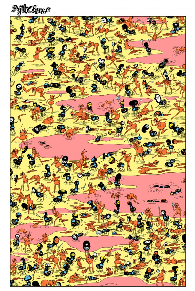 Last week I reviewed Drawn & Quarterly’s translated edition of BEAUTIFUL DARKNESS by Fabien Vehlmann and Kerascoet; these two books make excellent companion pieces, if you enjoy being ushered by stellar cartoonists into the heart of teeny-tiny sociopathy. But there is a key difference: while both are frightening and morbid books, the reading experiences diverge. BEAUTIFUL DARKNESS, for all its existential snarl, enraptures you with beauty and cuteness, begging you to offer up your heart for it to devour. It fills you with rage and hurt. ANT COLONY, meanwhile, has a flat affect and implacable presence. Both stories sweep you through carefully designed, grimly vicious universes, baffling nightmares where nothing vulnerable is safe, and where weakness is death. The difference is that BEAUTIFUL DARKNESS is a tragedy, and ANT COLONY thinks that shit is funny.