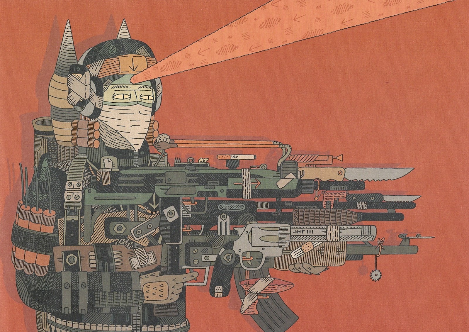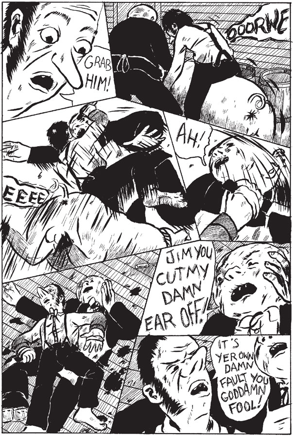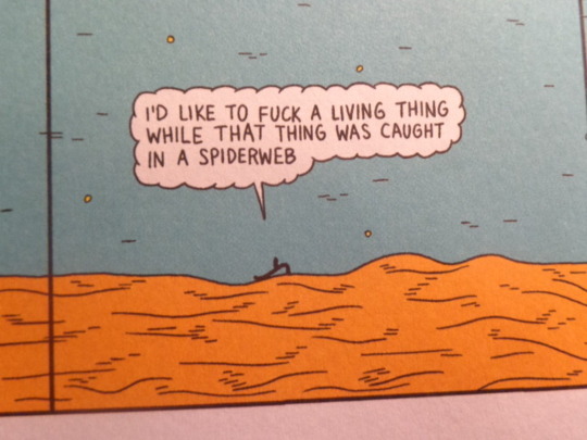 The exception is that one ant from the opening, the one bemoaning his itty-bitty stature. He seems to feel in a recognizably human way. He meditates, declares himself a pacifist, and refuses to take part in the war with the red ants. He reaches out for his boyfriend, who’s never anything but surly and aggressive. When he and four other ants go on the run, he tells them that they’re a family now. Watching his constant (sometimes pathetically needy) attempts to engage emotionally as they’re met by the pure autistic insectoid impassivity of the characters around him is the most affecting element of the book, its emotional core. But don’t mistake him for a point of view character – DeForge’s storytelling here has a blank, loveless gaze. Though often hilariously funny, his point of view is algid and bleak.