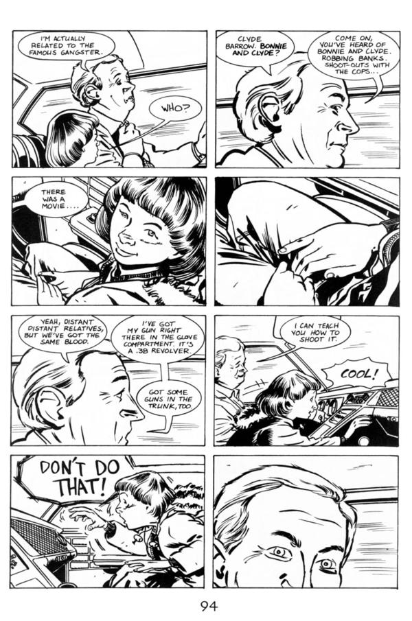 Which brings us to the greatest character in STRAY BULLETS — the only character who stubbornly refuses to be destroyed, despite all the suffering piled upon her: Virginia Applejack, damaged girl, endangered runaway, avenging warrior, gifted writer, and the ragged, resilient, fucked up soul of this series. We dip in and our of Virginia’s story, following her through the death of her beloved father, her escape from her hideous mother, through bizarre exploits from coast to coast, as she maneuvers herself into and out of trouble, bravely facing up to every new nightmare with resistance and guile, helplessly causing trouble with her vengeful, compulsive need to mete out justice to all bullies, as she finds her way into the margins or center of every major conflict in this gloriously rambling story. By the time we reach the end of the collection, this ensemble piece has clearly become Virginia’s story, a chronicle of how badly her experiences have marked her, how irreparably she’s been twisted by violence, yet how tenaciously she clings to her pride and virtue.