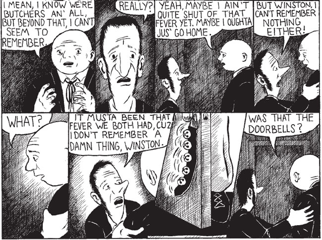 Jim and Winston are figures more familiar from the stage than from the funny pages. Dressed in identical black suits, hats and bolo ties, Winston is tall & thin with a long, pointed nose, Jim fleshy and round, his features barely disrupting the baby-fat pudge of his spherical head. They call to mind Laurel and Hardy. They arrive one morning, both mentioning that they felt sick and feverish the night before. They enter what they recognize as their butcher shop but it’s empty. No meat, no goods, nothing in the pantry. Slowly they begin to realize that they don’t seem to remember anything beyond their names and professions. They can’t remember how to go about doing their job, or where they are exactly, or how they got here. Then two women who seem to know them arrive — apparently these are regular customers — asking for a pork loin and a pound of ground chuck. Jim and Winston have to figure out how to deliver the product.