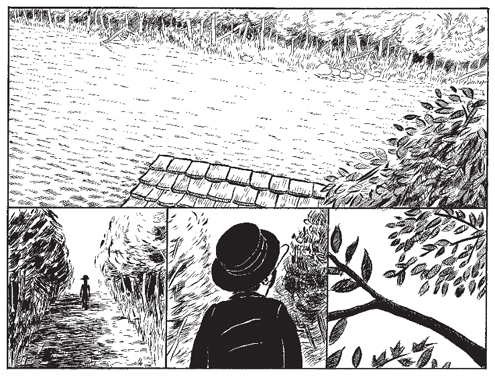 In one bravura four-page sequence, a sex scene between Dick and Virginia branches into the roots of a tree, the trunk of which flows into a river, which transforms into a topographical map, which, panning back, is revealed to be the sandbox in which Richard died. Everything is everything else — look at the sweep of history or a microbial organism and discover your own anxieties, grievances and hopes. The same messages are encoded into every sequence. When Virginia’s mother dies, her spirit just puffs our of a her chest as a little Pacman ghost, then floats off as a white silhouette against an empty black spread. Figuration, symbolism and narrative are jostling for page space, pulling against each other, as disjointed as they are unified.