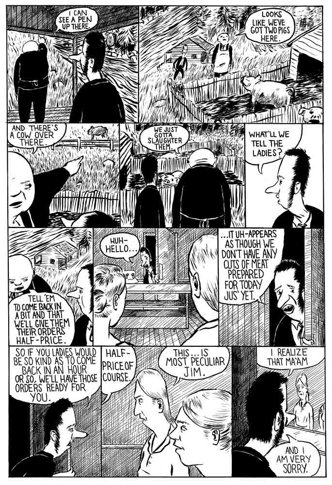 The centerpiece of the book is brutal slapstick horrorshow of incompetence and self-harm. Desperately searching the shop, they find a pig and cow out back, and realize their only way out of this is to figure out butchery by the seat of their pants. The lengths that they will go to to accomplish their grim task is funny and frightening; they seem to have a dreamy disregard for their own unsafety.