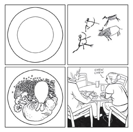 With their broad physical types, squabbling, and comical incompetence, they are slapstick figures forced into confrontation with an existential vacancy — precisely like WAITING FOR GODOT’s Vladimir and Estragon. In fact the whole premise feels theatrical — the empty shop like an unfurnished set, the identical costumes on the men, who don’t seem to know anything more than what you’d read in the opening to a script: Jim, butcher, tall and thin, dressed in black. Like so much avant-garde theatre, it takes advantage of the blankness of its setting — the bare room with false walls, the flimsiness of poor stage craft — to create a heightened superreality of characters on a stage rather than people existing in the world. But this is a comics page, an immersive space where anything can be drawn. The choice to heighten its artifice is disorienting, and pulls you into the momentary nature of the story, the hovering unknown nervous responsiveness in which these characters seem to exist.