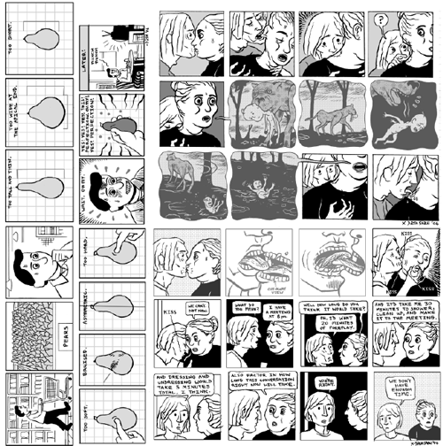 Much of Dash Shaw’s brilliance lies in the way be brings his ravenous appetite for innovation to tender, human narratives. Though he seems to be devising his approach in the moment, restlessly mining his inventiveness page by page, the stories are old and the characters familiar. His books are small, well-observed and subtle, but his themes are huge and unmanageable, the stuff of great literature — brotherhood, envy and crumpled desire in NEW SCHOOL, for instance, or loneliness, obligation and loss here in THE MOTHER’S MOUTH. These pure evocations of human longing are the emotional backbone of his work, powerful pulsing centers that guarantee that these stories, for all their obfuscating experimentalism, will never buckle under the weight of their own ambition.
