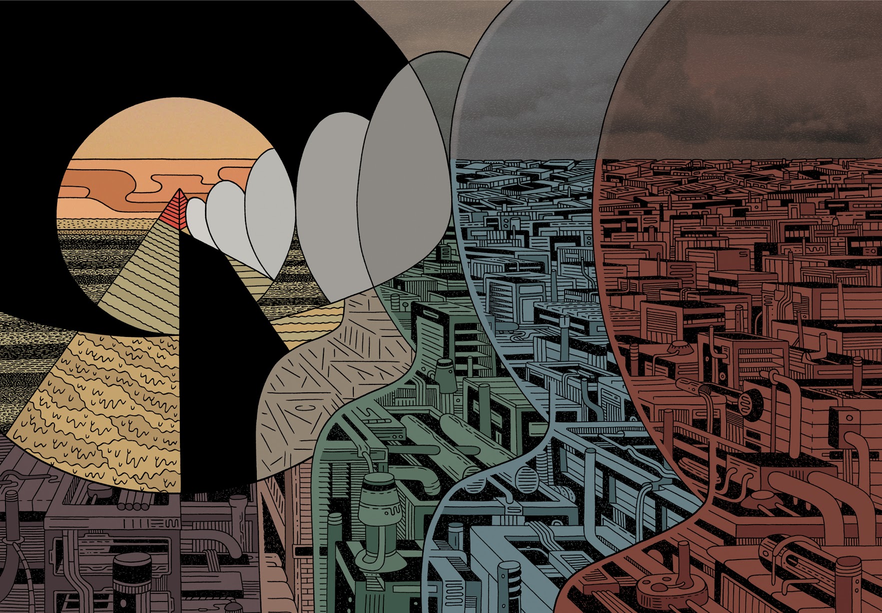 In this thematically and stylistically linked series of wordless illustrations, Ramsey’s art bends and folds in on itself, redoubling and kaleidoscoping into endless patterns, fractals, double helixes and splintered nuclei, building a mythos of interconnection and unearthly mystery. There’s no rendering in these hyperdetailed kenophobic drawings – just an endless, roiling ocean of squiggles and geometric shapes: anarchic, filigreed abstraction wriggling within the strictures of gorgeously designed clean-line compositions. His stretched-out landscape-format images bubble and twist, exploring the endlessly replicating, mirrored architectures of both our universe and culture. As above, so below.