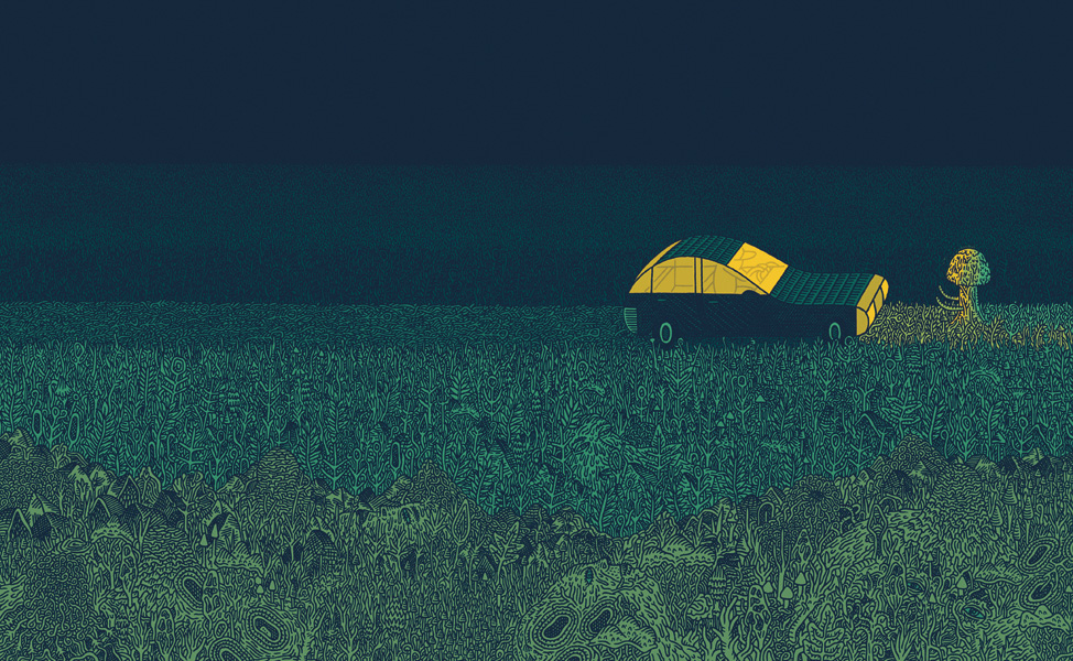 By the next morning the little people have set up camp around the girl’s body, cleverly re-purposing her belongings as survival supplies. A notebook becomes a tent; a pencil case becomes a watertight sleeping bag. Aurora, with all the pluck and self-sacrificing gumption (as well as the big dew-drop eyes and polka-dot dress) of a Disney heroine, takes it upon herself to lead the effort, setting up a kind of triage & rationing station inside the little girl’s purse. Over a few days, their society takes shape according to its needs and its personalities. Aurora makes friends with the field mice, who help her find berries.